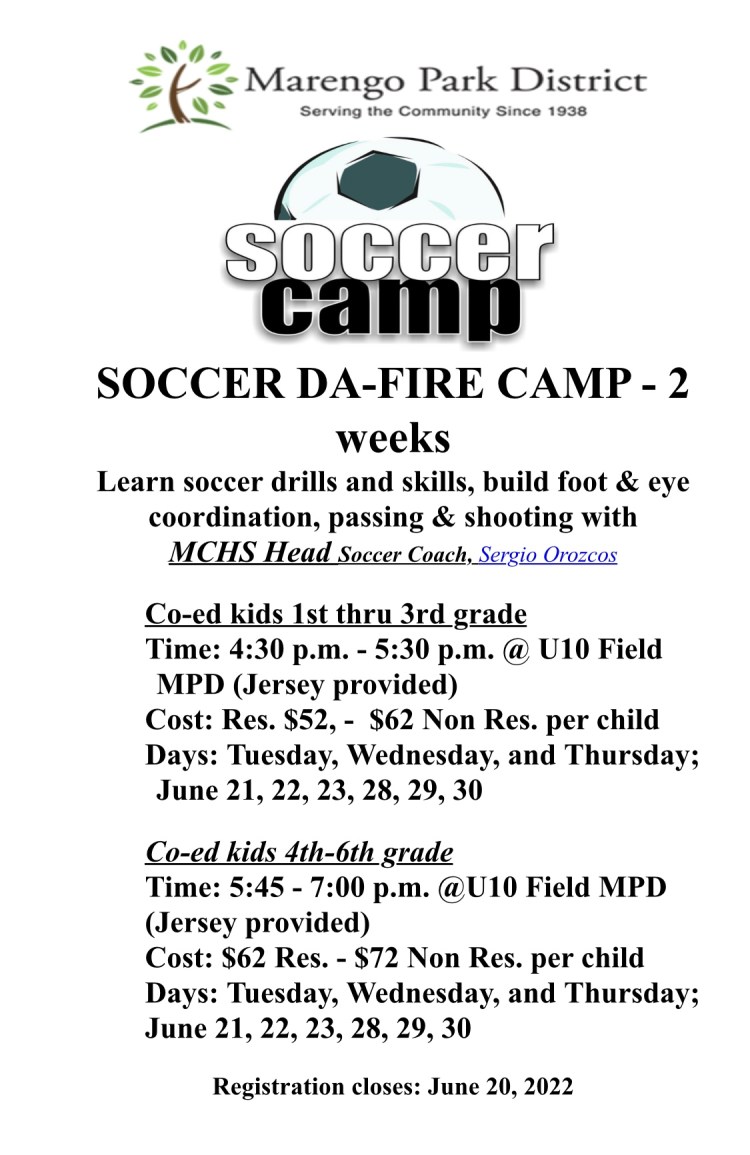 The camp will be conducted by head soccer coach Sergio Orozcos and starts on June 21 sign up now at http://www.marengoparkdistrict.org.