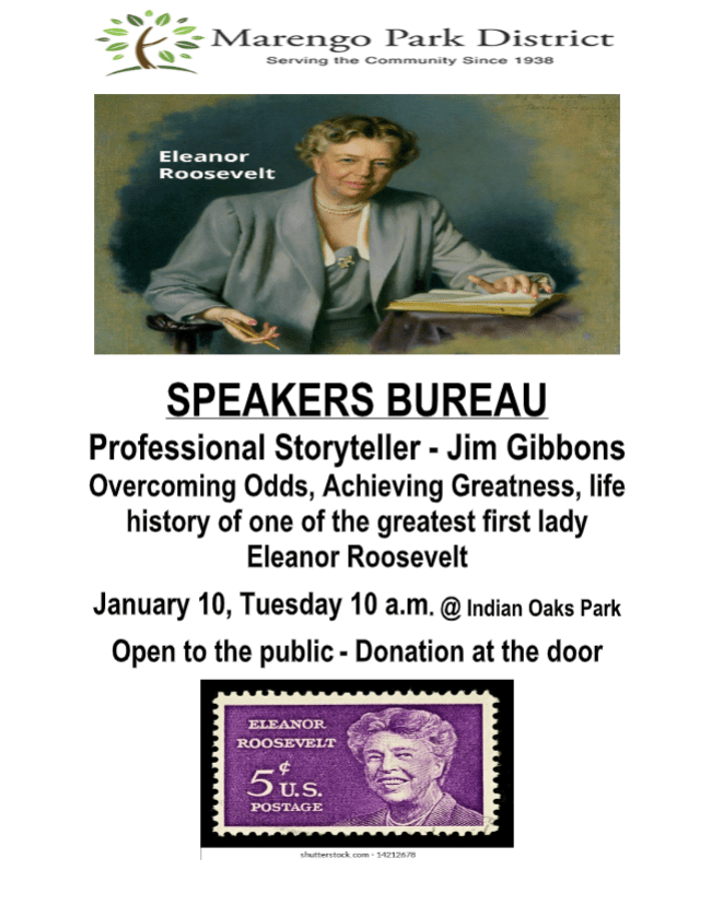Eleanor Roosevelt – Jan. 10th Posted bypersisgilDecember 28, 2022Posted inUncategorized Come listen to storyteller Jim Gibbons share the life and times of one of America’s greatest women. Share this: Share on X (Opens in new window) X Share on Facebook (Opens in new window) Facebook Like Loading...