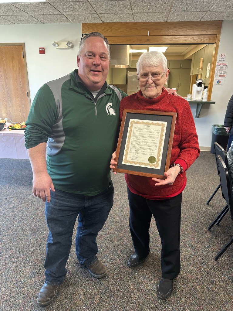 Board President Marty Mohr presents a Resolution to Vera for her service to the park and our seniors and honoring her on her 90th birthday today at the park where she was joined by family and friends.
