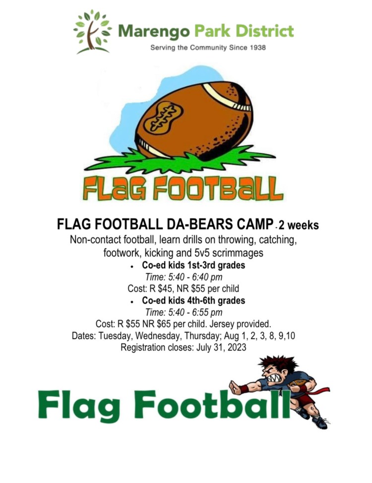 Flag Football Camp starts next week, sign up now Posted byDan BertrandJuly 24, 2023Posted inUncategorized Share this: Click to share on X (Opens in new window) X Click to share on Facebook (Opens in new window) Facebook Like Loading...