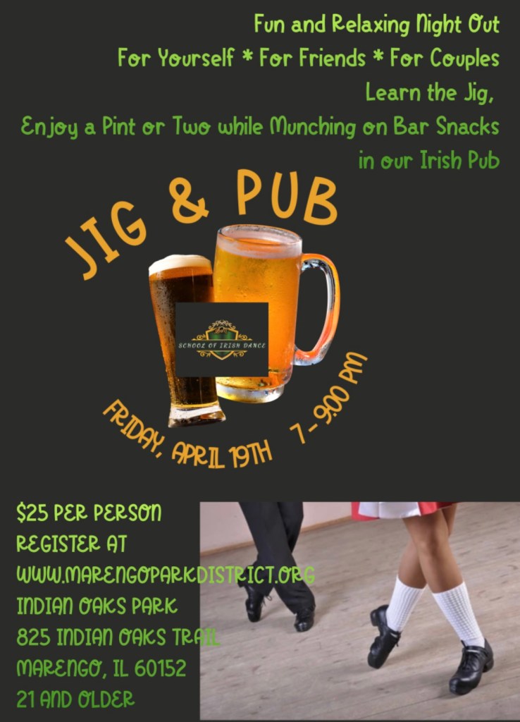 We are excited to offer to our adult patrons a night of dance, laughter and drink as we present Jig & Pub @ Indian Oaks Park on Friday night April 19th 7-9pm. Learn the basics of the Irish Jig then head on over to our quaint Irish Pub as we serve pints and pub snacks. Must be 21 and over to attend. Guiness, Harp and O’Doul’s will be available by our seasoned bartender Marty.