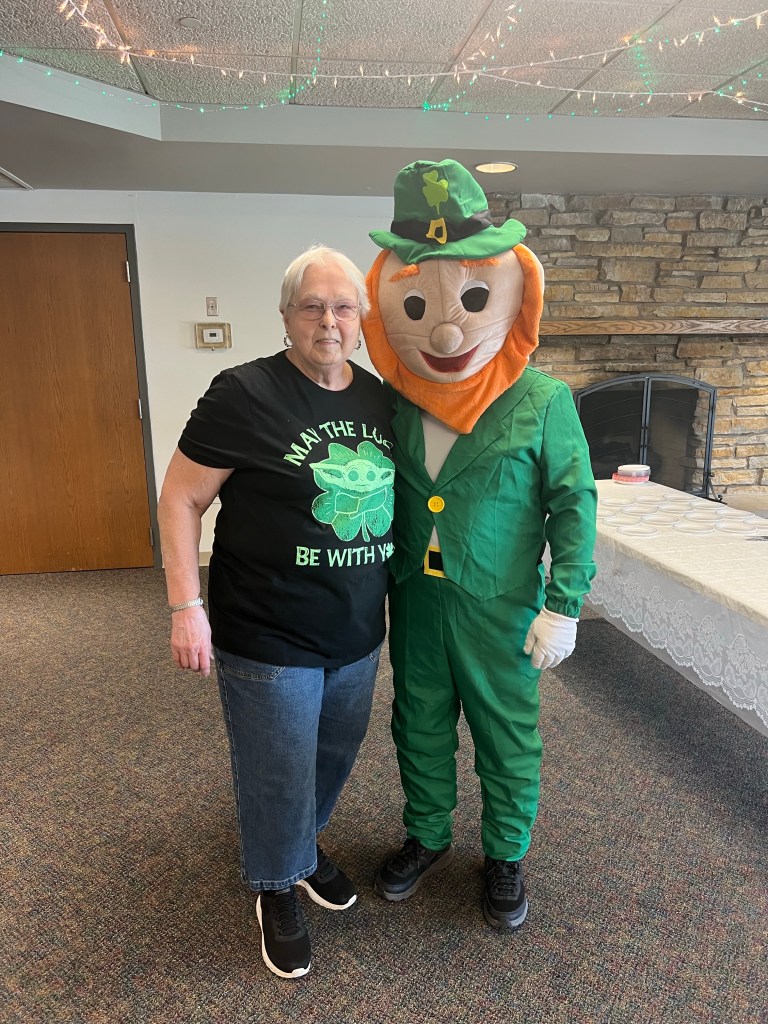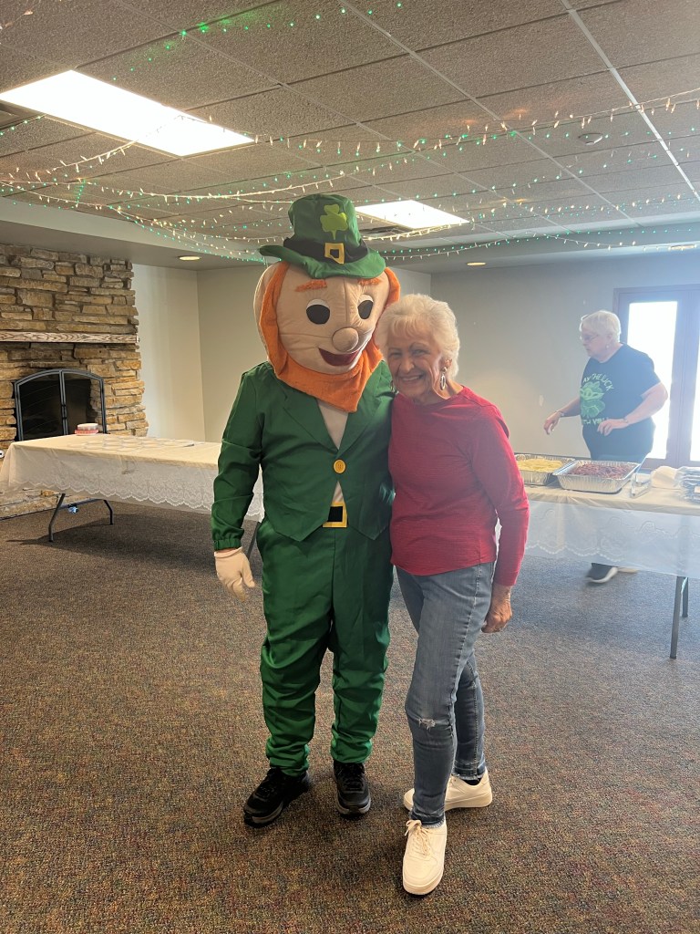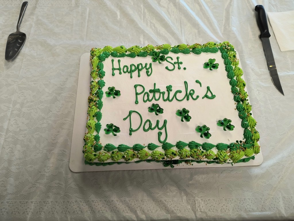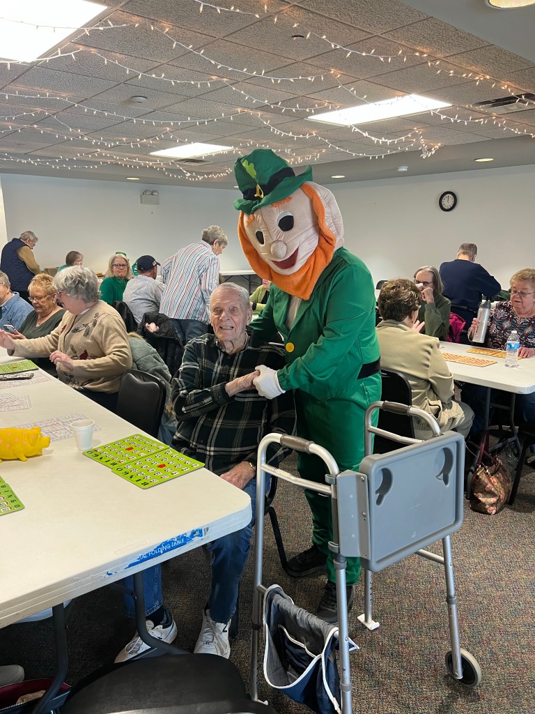 Patty, the leprechaun made an appearance today at the senior bingo. In which they had a wonderful corned beef, cabbage, luncheon, and cake.