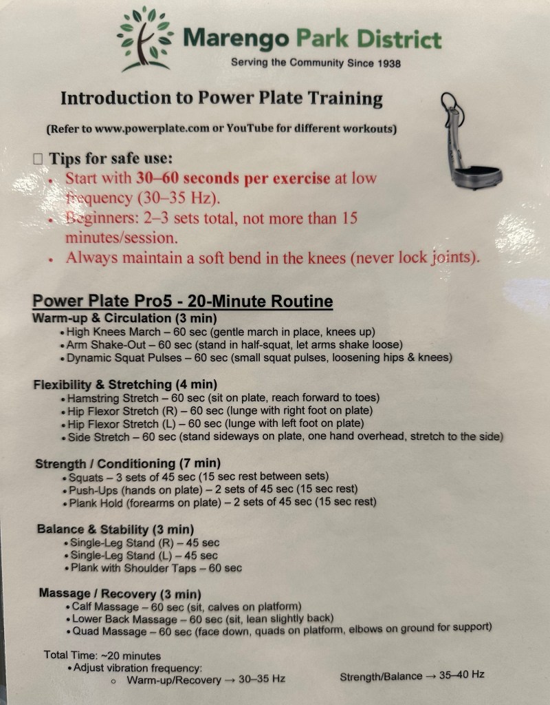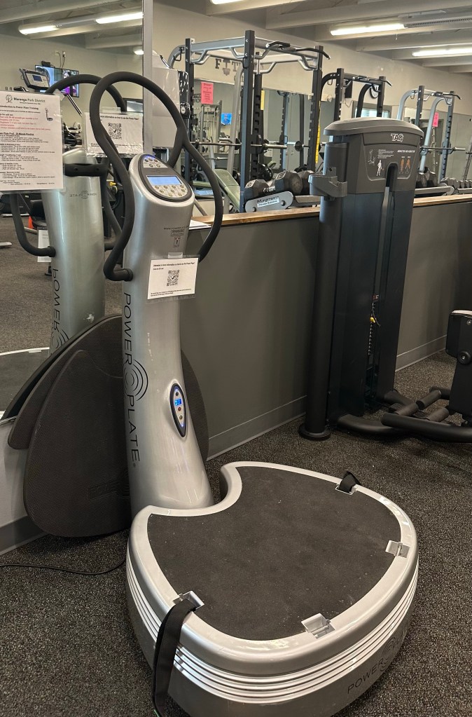 Stop by and check out our new PowerPlate machine in the Park fitness center. You can find information about it at http://www.powerplate.com. It is a great piece of equipment that is used for stretching and flexibility, strength and conditioning, massage and recovery, balance and stability, and circulation and warm-up. It uses low frequency vibrations of 30 to 60 times per second. It is used by many NFL and NBA teams. Check out their website or we have information in the fitness center about how the equipment can be used and what it is used for.