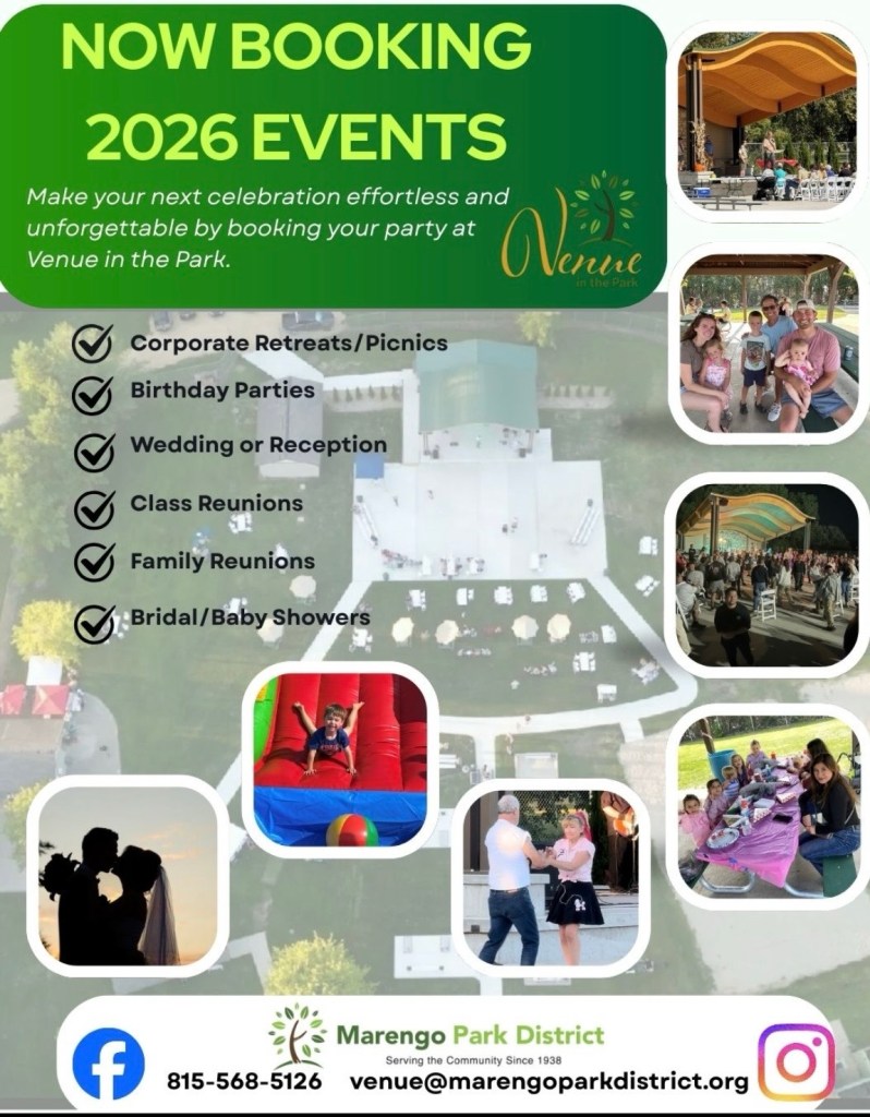 Book your summer family or class reunion, birthday party, corporate event, wedding or other event now at the Venue in the Park. Email venue@marengoparkdistrict.org.